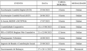 Estamos divulgando o calendário de eventos, com as datas e carga horária para os cursos que realizamos anualmente, visando o planejamento e agendamento aos interessados: