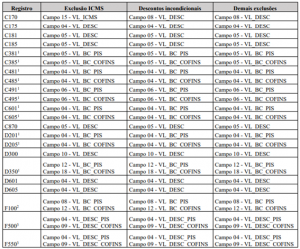 O ajuste da base de cálculo do PIS/Cofins pela exclusão do ICMS deverá ser realizado de forma individualizada em cada um dos registros a que se referem os documentos fiscais, de acordo com a tabela abaixo: