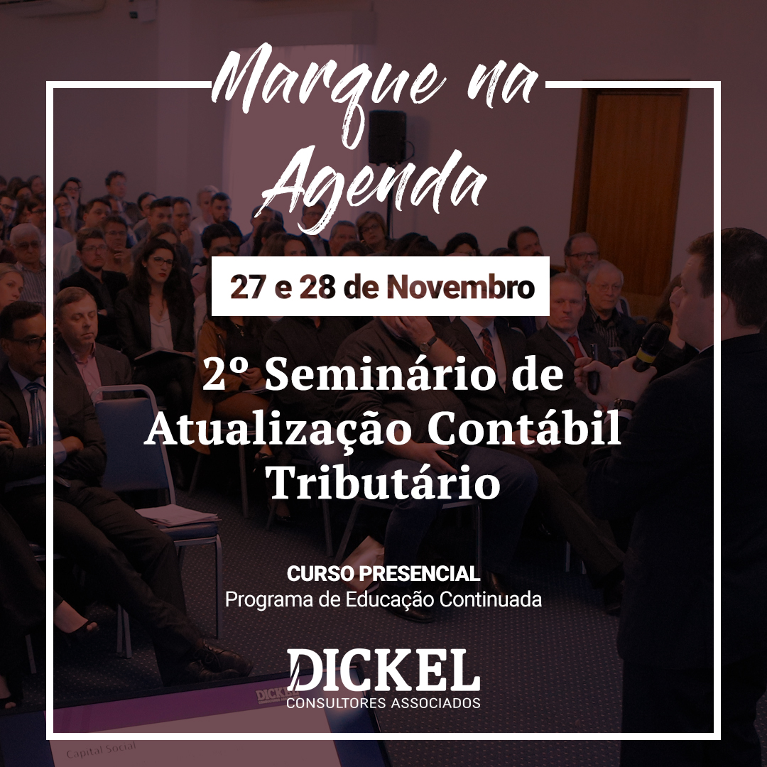 Marque na sua agenda! Dias 27 e 28 de Novembro, 2º Seminário de Atualização Contábil Tributário com a equipe da Dickel Consultores.