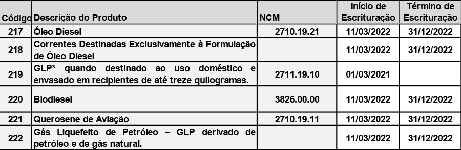 No que tange a tributação de PIS e COFINS, as alíquotas incidentes sobre a receita bruta decorrente da venda de óleo diesel, correntes destinadas exclusivamente à formulação de óleo diesel, biodiesel, gás liquefeito de petróleo – GLP derivado de petróleo ou gás natural e querosene de aviação foram reduzidas a zero, no período de 01/03/2022 a 31/12/2022.