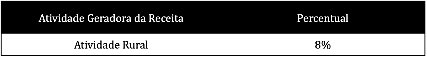 Sobre a receita bruta serão aplicados os percentuais de presunção do IRPJ, conforme tabela abaixo: (Lei n° 9.249/95, artigo 15; Decreto n° 9.580/2018 – RIR/2018, artigo 592; Instrução Normativa RFB n° 1.700/2017, artigo 33)
